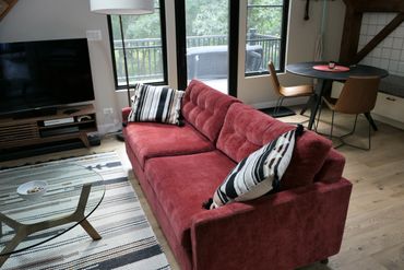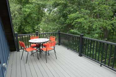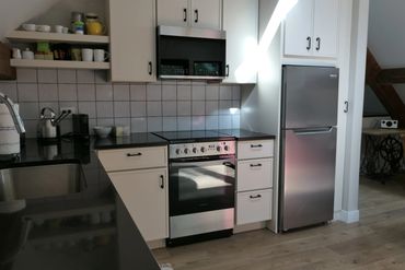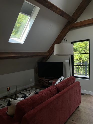 The barn apartment is a stunning conversion of the loft of our barn. Accessed by external steps leading to a huge (10’x20’) deck overlooking the pond, it has one bedroom with a Queen bed, an open-plan living room / kitchen, and a beautiful shower room under the oak beams. The living room includes a very comfortable sofabed, and there is plenty of room for airbeds (available upon request) or travel cots if required for young children.